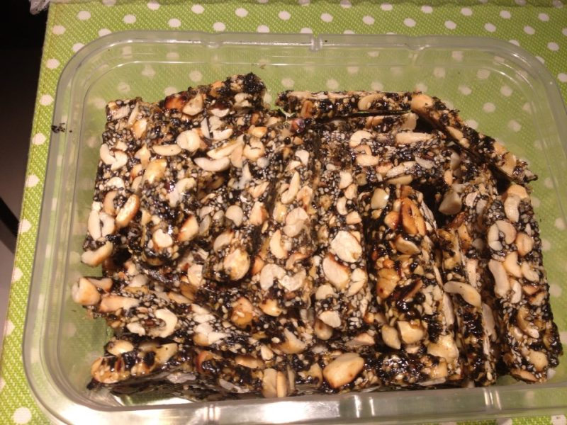 4:小火,一人倒花生芝麻一人迅速翻搅(个人觉得找两把硬厚实的不锈钢勺子)马上倒入涂了无味的色拉油烤盘里,用力拍结实(我用的擀面杖)弄了半盘!整好了马上倒出来切!趁热切!切好后隔开摆好,凉了就装密封盒!