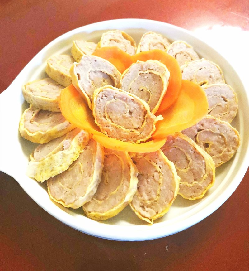 1:鸡蛋液打到看不到蛋白,然后倒入淀粉液,我忘记拍了,然后放锅里作成鸡蛋皮,等全部做好,可以作肉糜,肉糜就按照猪肉圆子的方法,我在里面放适量山药,我喜欢脆脆的口感,鸡蛋猪肉卷起来以后上锅蒸熟,放凉