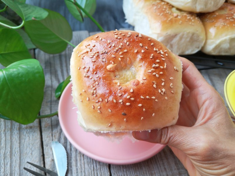 12:面包坯醒发1.5倍大小时,预热烤箱,上下火160度。面包表面刷蛋液撒白芝麻,用擀面杖的一头蘸蛋液,在面包坯的中间压下去,并在孔洞中撒芝士,入炉烘烤25分钟,表面金黄色即可出炉。