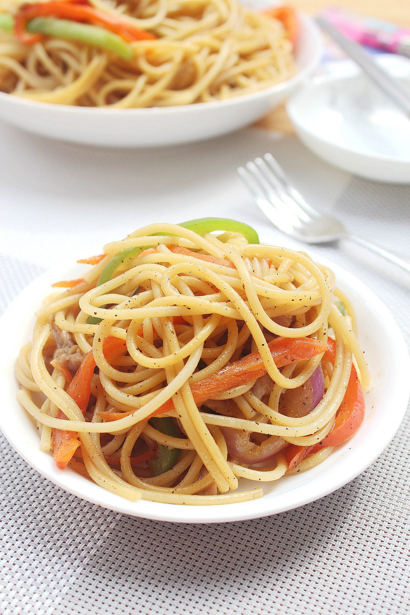 5:倒入意粉和午餐肉,翻炒至干水,加黑椒粉1/2茶匙、糖1/2茶匙、生抽2汤匙、蚝油1汤匙和精盐适量,兜均匀即可装盘食用。