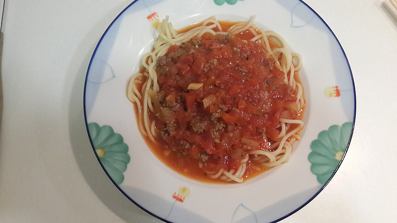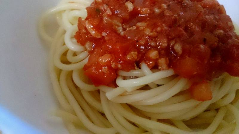 意大利面2人份;番茄两个;洋葱半个;牛肉糜80g;蒜3瓣;