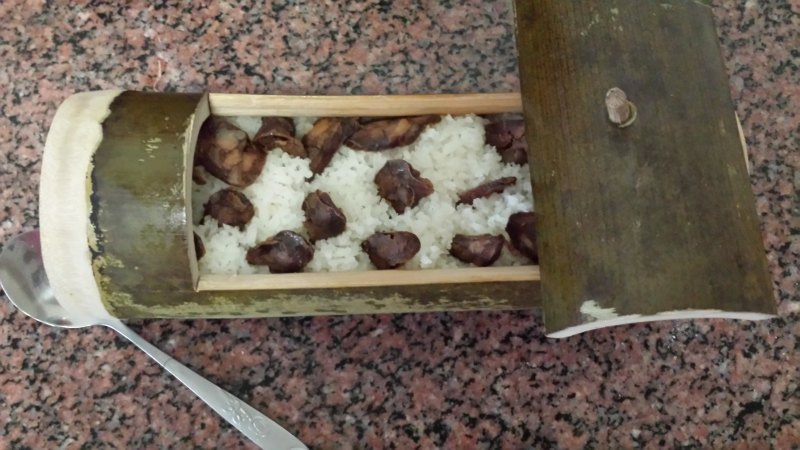 7:腊肠的油和咸味都侵入了米饭里,很香,太热了,从出锅孩子就喊着要吃,嘿嘿,主要是没见过竹筒