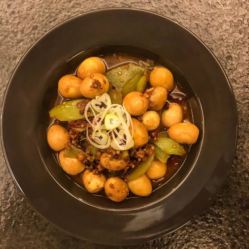 1:材料:鹌鹑蛋(已煮熟剥壳)、干辣椒(已剪开)、花椒、葱段