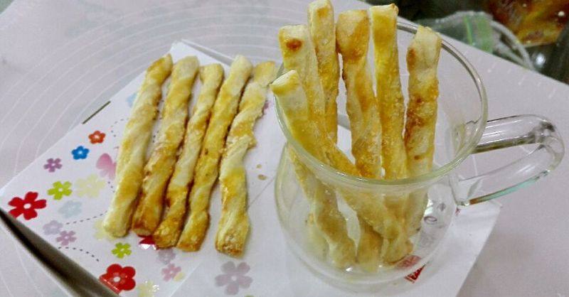 15:将长条两端捏起,拧2、3圈成螺旋状,排入烤盘(此配方份量可排2个烤盘)。静置15分钟,放入预热200度烤箱,先以200度烤8分钟,再将温度降低至170度再烤8分钟,至表面金黄色即可出炉。(请根据各家烤箱脾性,掌握烘烤温度,烘烤途中,观察酥条着色后,可加盖锡纸烘烤)