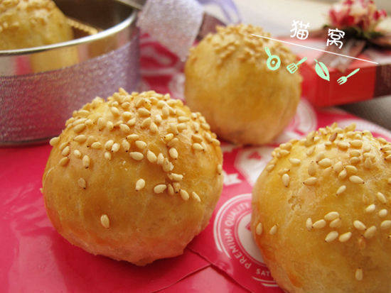 7:包好的黑芝麻蓉收口向下,放烤盘内,表面刷上蛋液,撒上芝麻进烤箱烘烤,温度170°下火,时间约22分钟
