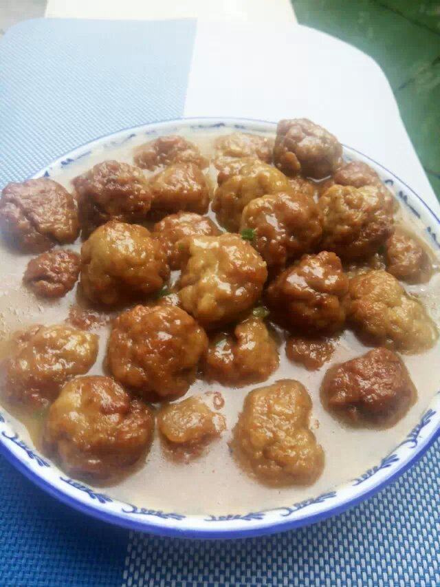 3:炸成棕色即可捞起,再把丸子全部倒入锅中,加水,水加至丸子中部,开大火煮,加入少许酱油,味精,用水淀粉勾芡即可。