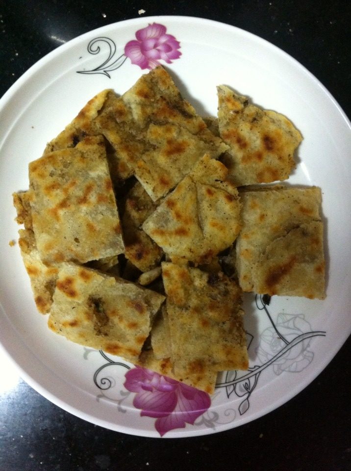 11:锅底少许植物油,烧至5成热的时候将面饼轻轻拖入锅里,小火加盖煎2-3分钟,然后关火焖3分钟左右。为保证饼内部完全成熟,第一要将面饼擀的比较薄,第二在煎的时候关火焖3分钟左右!