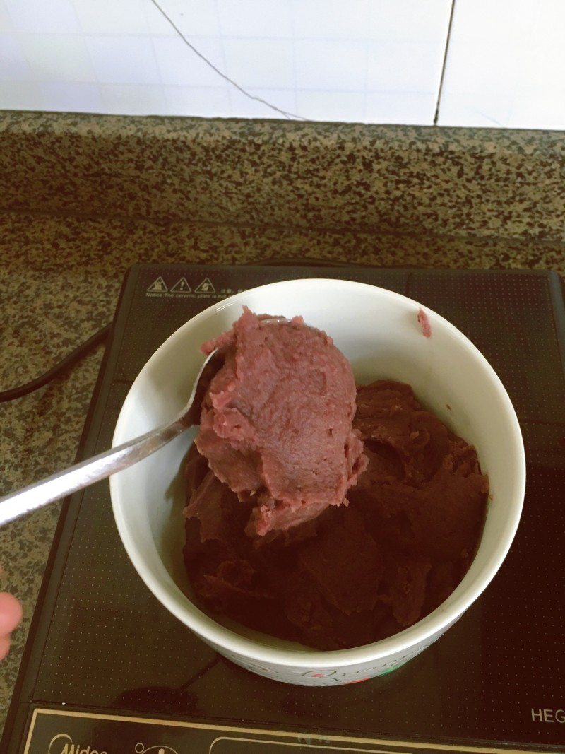 1:红豆洗净用清水浸泡一夜,第二天取泡好的红豆,加清水小火煮到软且水收干,用小勺子捣碎,加少许白糖,拌匀,放凉就可以了。(提前浸泡红豆可以减少煮的时间,使红豆煮软的同时还能保留颗粒感。)做好的红豆馅,备用,如图所示。