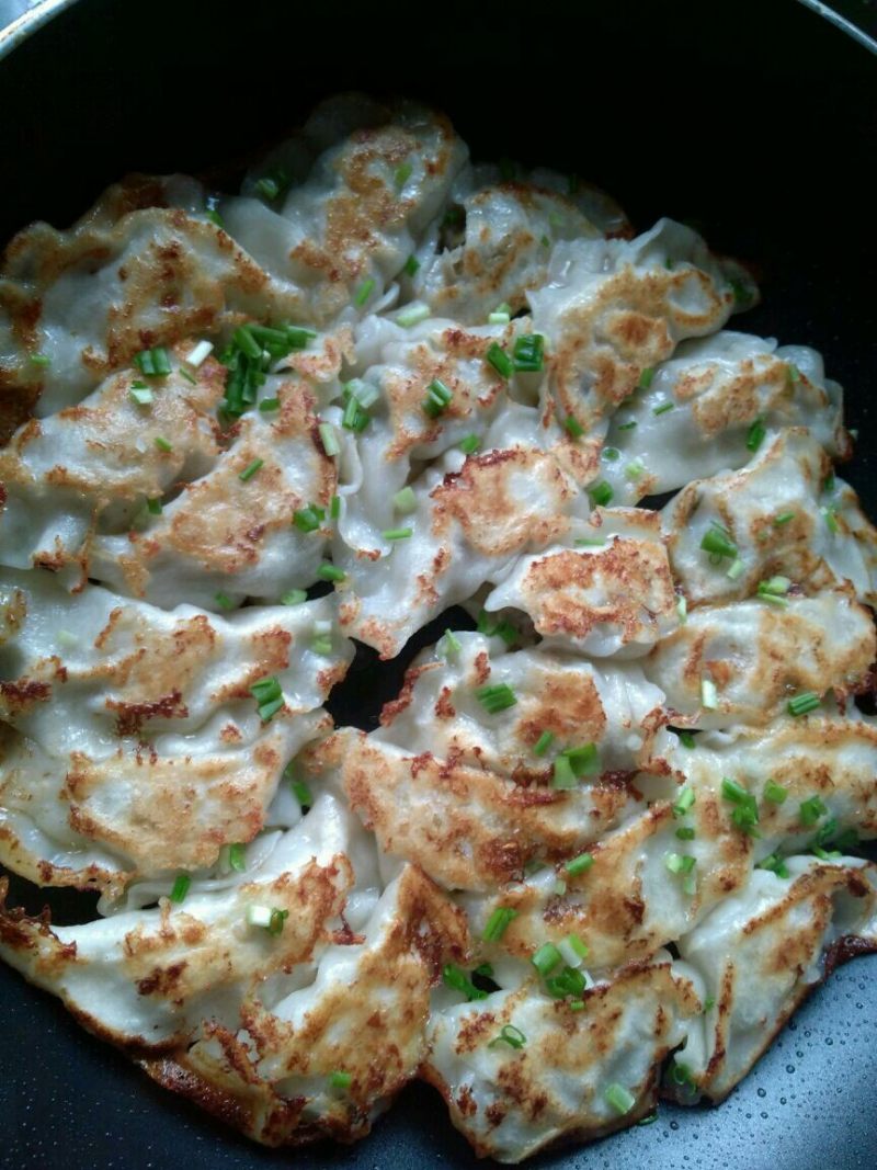 4:下锅~用热水~刚没过饺子即可~快干的时候放油~记得煎的时候要受热均匀