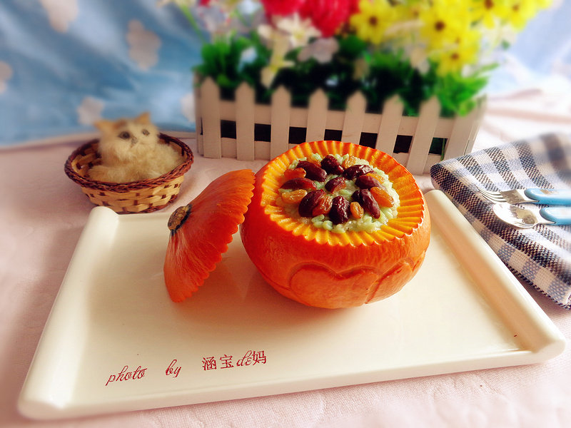 8:再放一层米饭,摆上葡萄干和枣,直到填满黄金瓜