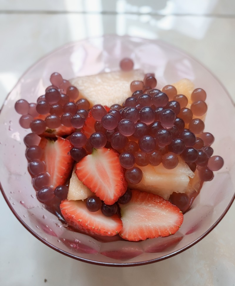 哈密瓜0.2kg;草莓数颗;小芋圆2勺;小汤圆2勺;
