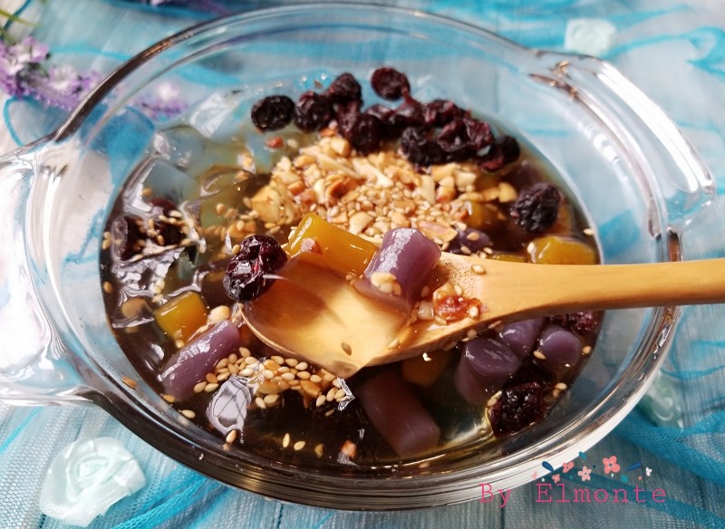16:把冰粉,芋圆放碗里,浇上红糖浆,再放上花生碎,芝麻,蔓越莓干就可开吃了。(也可以加上喜欢的水果。)