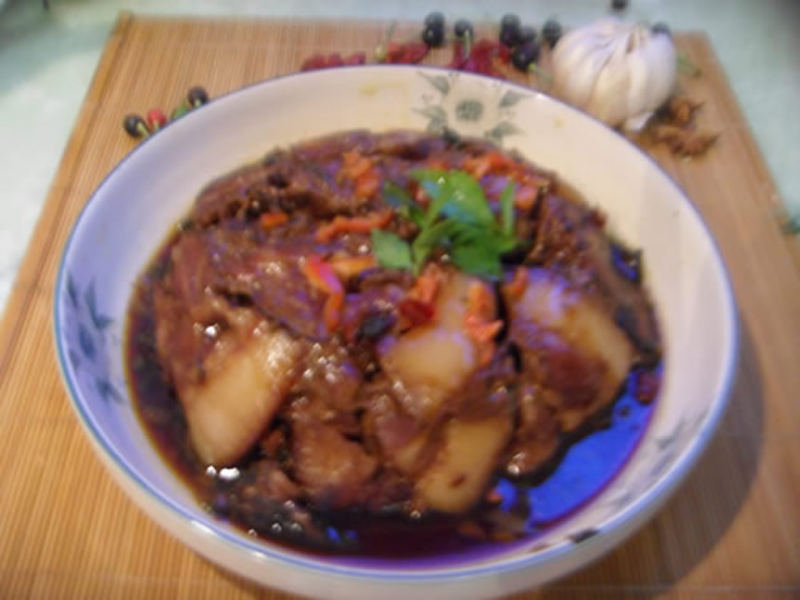 8:将蒸好的梅菜扣肉倒扣在圆盘中即可。完工!