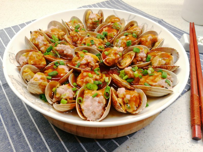 4:把猪肉馅嵌入蛤蜊中,依次摆好,准备好调料汁用适量水搅拌均匀待用。
