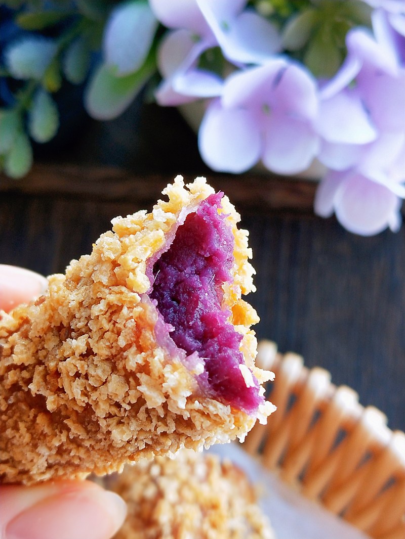 1:紫薯洗干净,蒸熟,去皮,用料理机捣碎成紫薯泥;