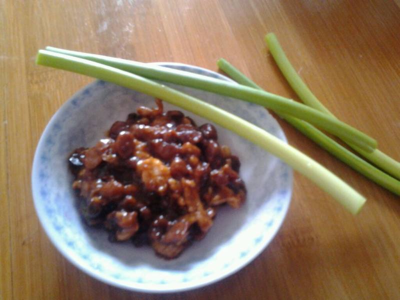 1:真空包装的豆豉直接倒出,稍微切碎。