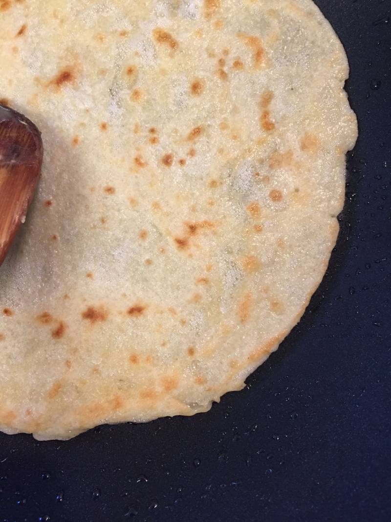 3:摊好的饼用保鲜膜盖上,等吃的时候不会干硬