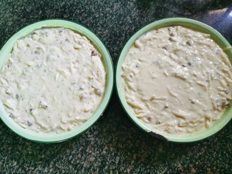 6:取一模具,抹上油,倒进腊肠萝卜糕材料