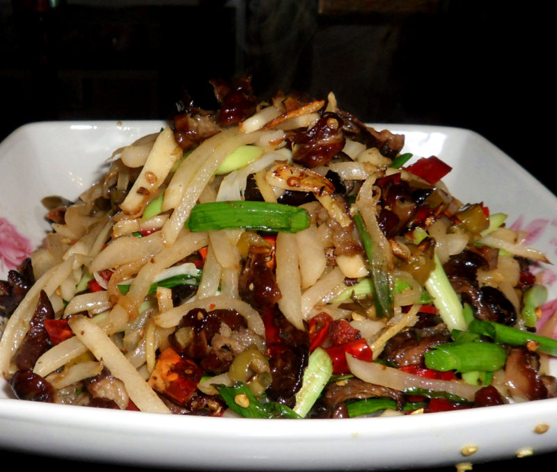 11:再把稍微炒至有味的萝卜丝和腊大肠翻炒均匀。