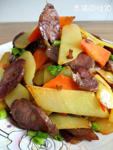 腊肠3根;土豆1个;胡萝卜1个;葱姜蒜适量;盐适量;鸡精适量;