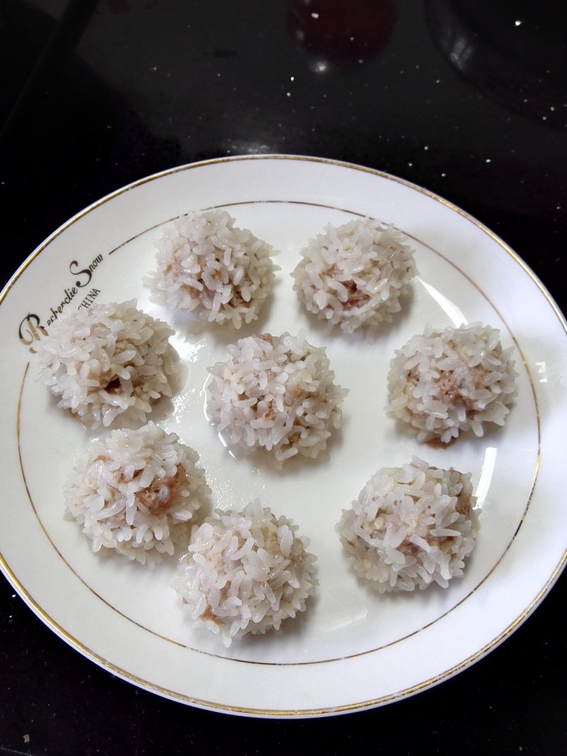4:取适量肉馅揉成小圆丸子,粘匀糯米轻轻压一下。