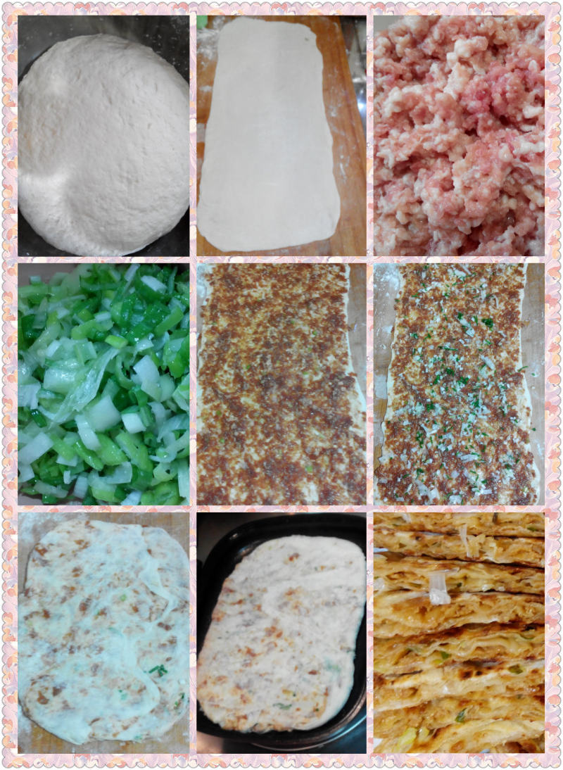3:圆饼上抹肉馅。一步一步叠起来。封口。稍微拍扁。