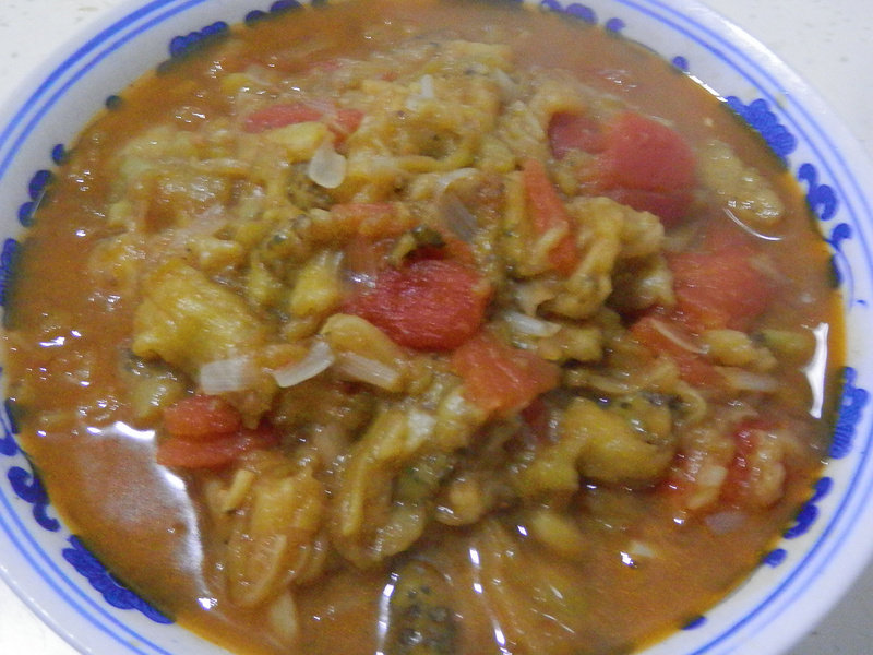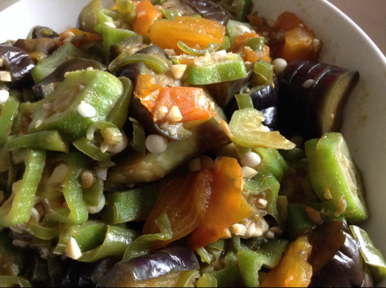 3:锅烧热,加入油,下蒜泥尖椒,煸炒一会儿加醋,炒出醋香后加番茄,炒出汁,下茄子,加适量水,煮一会儿,待茄子半熟加入秋葵,翻炒收汁即可。