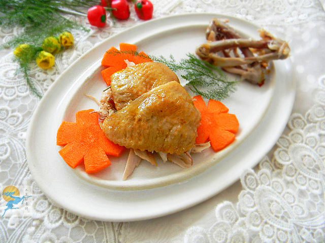 12:我用胡萝卜刻成花朵状,装饰摆盘,肉丝上面盖上鸡翅中的外皮。