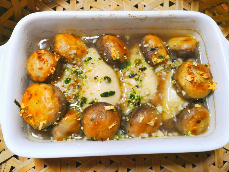 8:倒入鸡汤和蘑菇,撒上蒜蓉,烤箱180度烤10分钟即可。