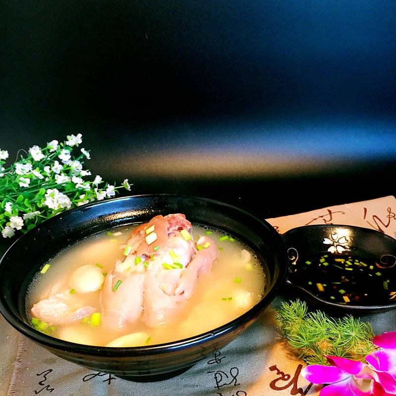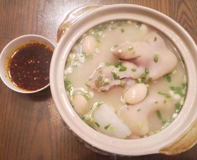 25:吃时再碗中放些盐,盛入猪蹄汤,蘸配料食用。