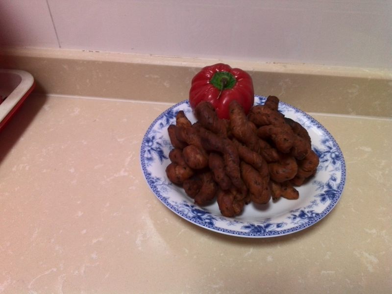 5:油烧制3成热下锅炸至金黄即可。使用中小火即可(我的火候有点大了,所以颜色比较深,败笔啊!)