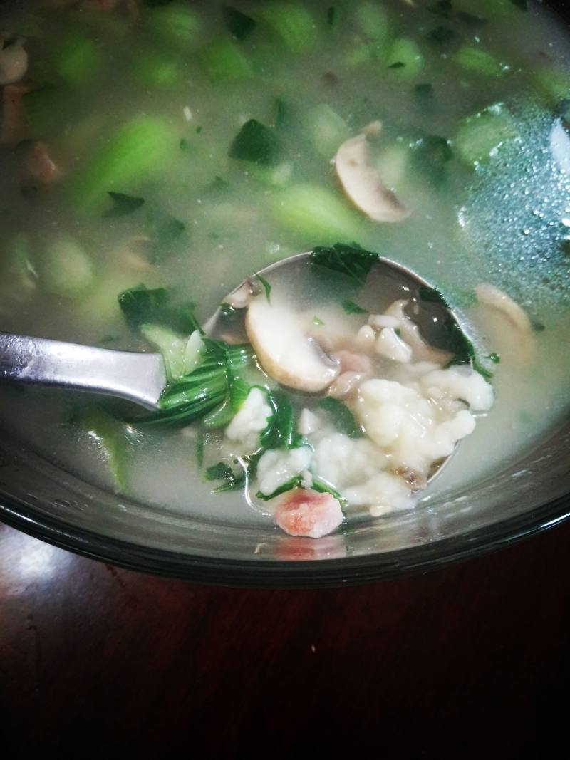 3:1.油锅烧热,蘑菇和香肠炒一下2.冷水调一碗水淀粉备用再调一碗面糊(浓酸奶的稠度)3.往锅里加热水,烧开后下青菜用勺子划面疙瘩(让面糊挂在勺上自己滑)4.搅拌一下,下入水淀粉。盐,椒盐,酱油,鸡精调味淋几滴香油,出锅。