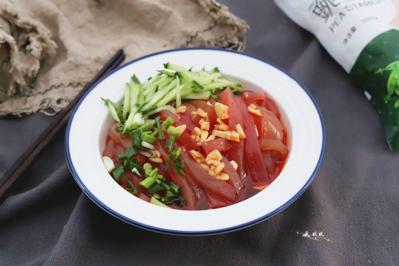 9:豌豆凉粉切丝,摆入盘中,把黄瓜丝,小葱放到凉粉上,浇上料汁,吃的时候拌匀即可,香辣爽滑,冰凉可口,外面这样一份凉粉起码要十几块吧,在家做,十几块的成本够全家人吃上很多顿。
