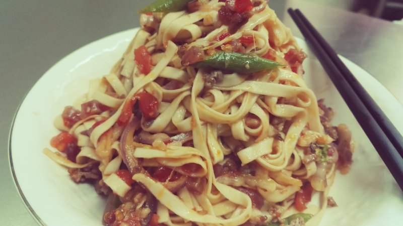 4:4,锅把油烧热,下入肉末炒香,下甜肠炒出腊味下,西红柿炒一下接着下洋葱白菜炒香下入面条
