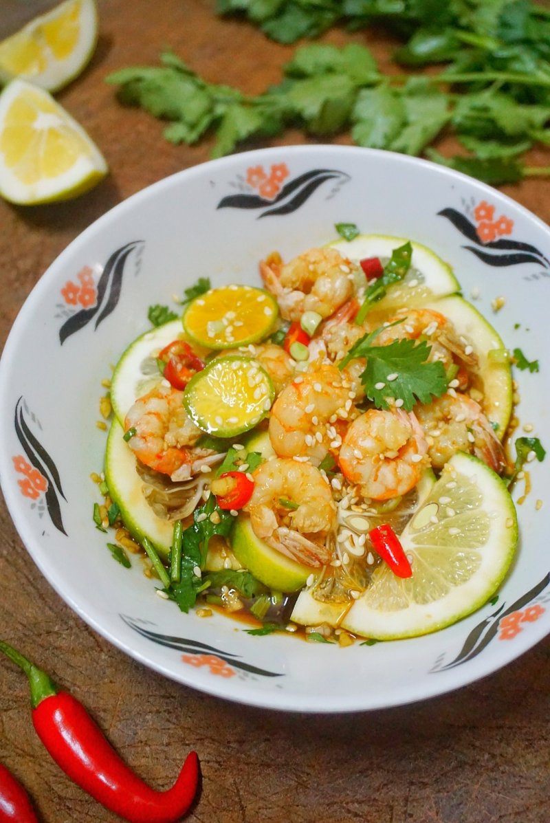 5:碗里放入虾仁,柠檬和小青桔,淋上酱汁,撒上白芝麻和香菜碎,搞定。
