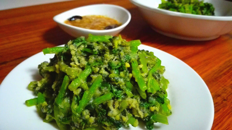 3:将茼蒿分为两份,一份加入适量玉米粉,一边加一边用手拌匀,直至茼蒿表面都均匀的裹上薄薄的一层