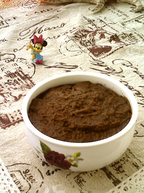 5:搅拌的步骤没拍下来。因为手机没电啦。打成泥以后就倒回锅里加入白糖、冰糖,边煮边搅拌一直搅拌着啊,不能停否则容易糊。搅拌至有阻力、提起来不容易滴落就可以出锅了。大概35分钟这样。