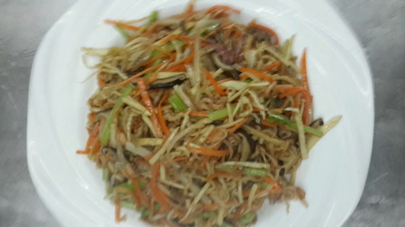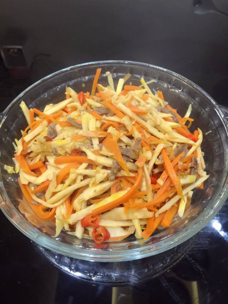 1:准备好食材,切丝!三丝:笋丝、胡萝卜丝、肉丝。还有蒜末辣椒适量