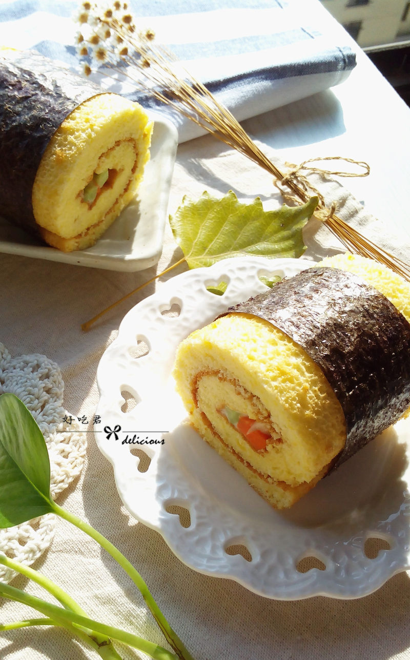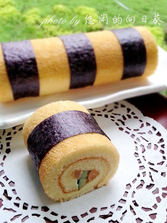 17:紫菜剪成条儿状,卷在蛋糕上。