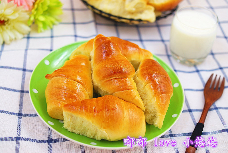 高筋面粉380g;糯米粉40g;牛奶225g;酵母5g;黄油35g;
