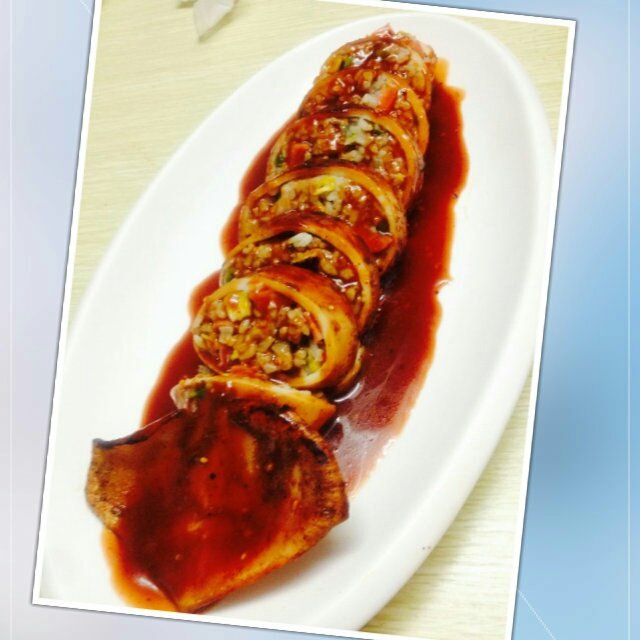 5:另热锅加油,将固定好的包饭鱿鱼放入锅中小火慢煎,直至鱿鱼表面金黄即可。