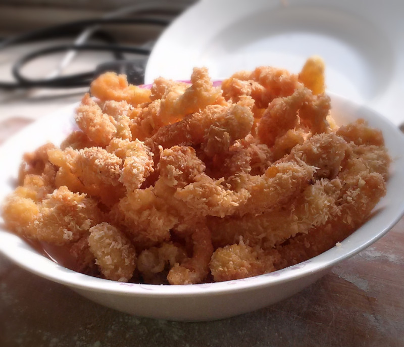 3:抖去多余的脆炸粉,调好脆炸粉浆,按照比例(炸粉:水=1:1.5)调浆。