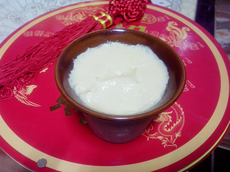 2:放入牛奶,搅匀,过滤去气泡,盖上保鲜膜,保鲜膜用牙签扎几个孔。上锅蒸15分钟。撒上黑芝麻,放上摆好造型的香蕉泥。