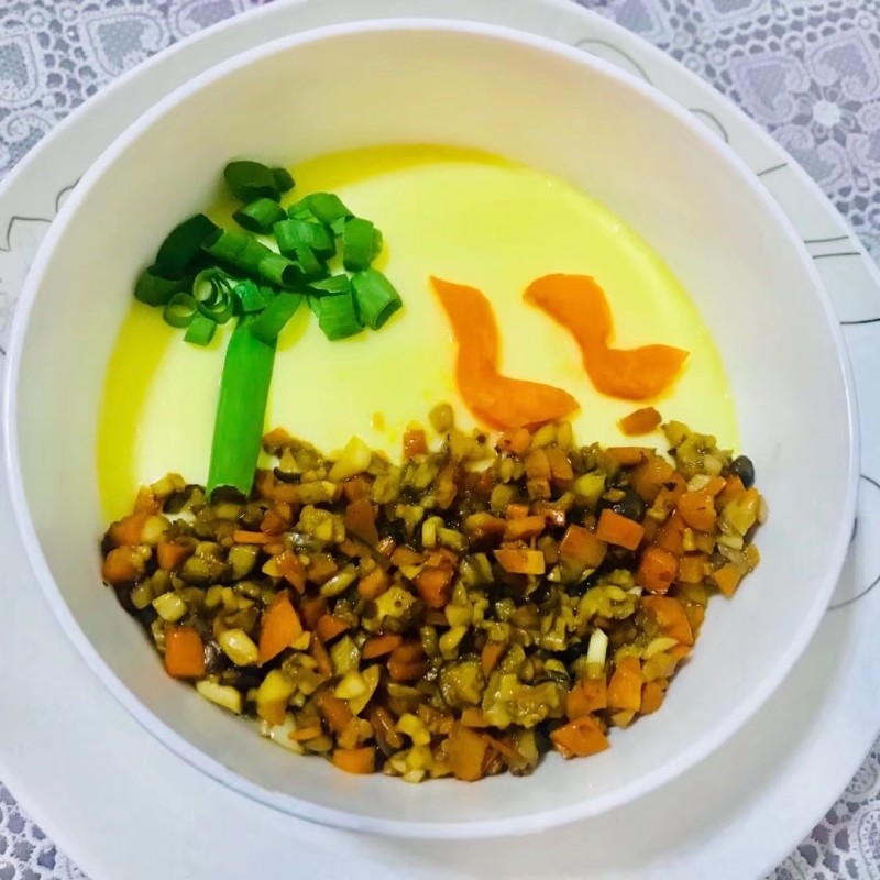 3:香菇末,胡萝卜丁和肉末一起炒熟,放到蒸好的鸡蛋羹上,此款鸡蛋羹放水。