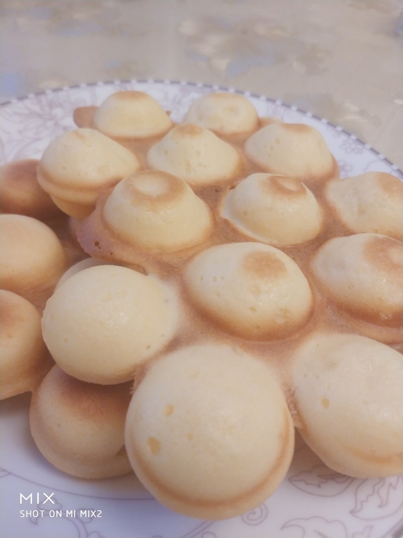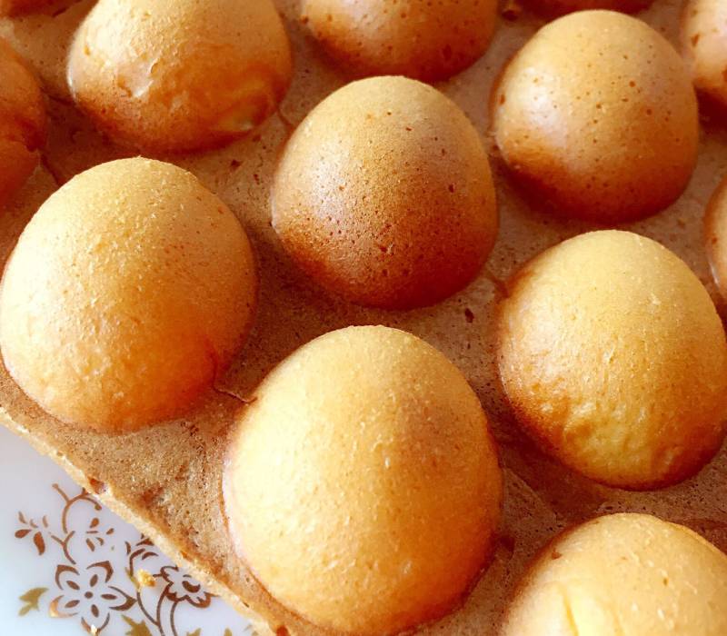 9:约3-5分钟,烤到颜色金黄,没有水气冒出来即可出炉。刚出炉时是稍软的,用风扇吹一分钟即成香脆的鸡蛋仔