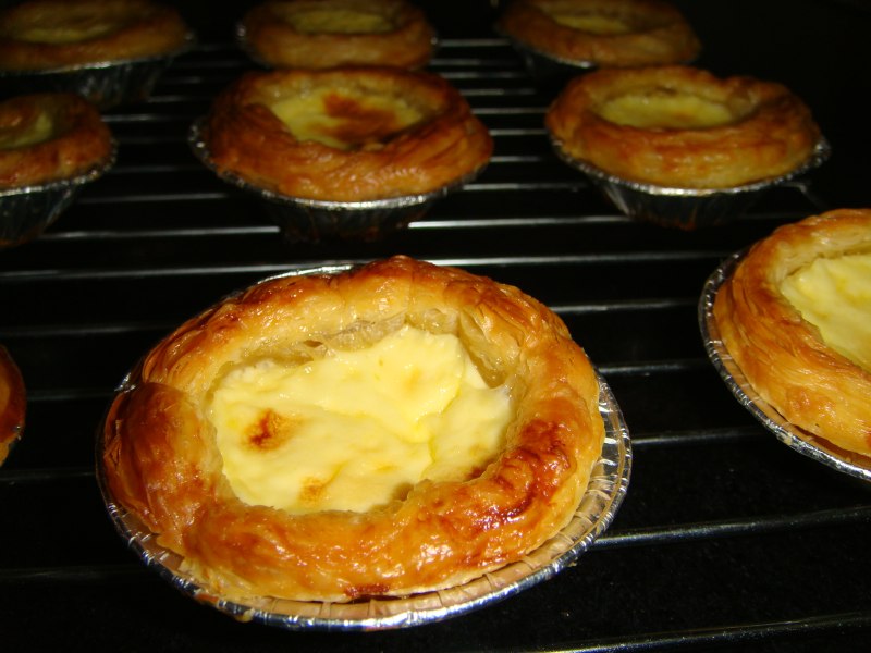 6:蛋挞皮摆入烤盘中。把做好的蛋挞水倒蛋挞皮中,7分满。