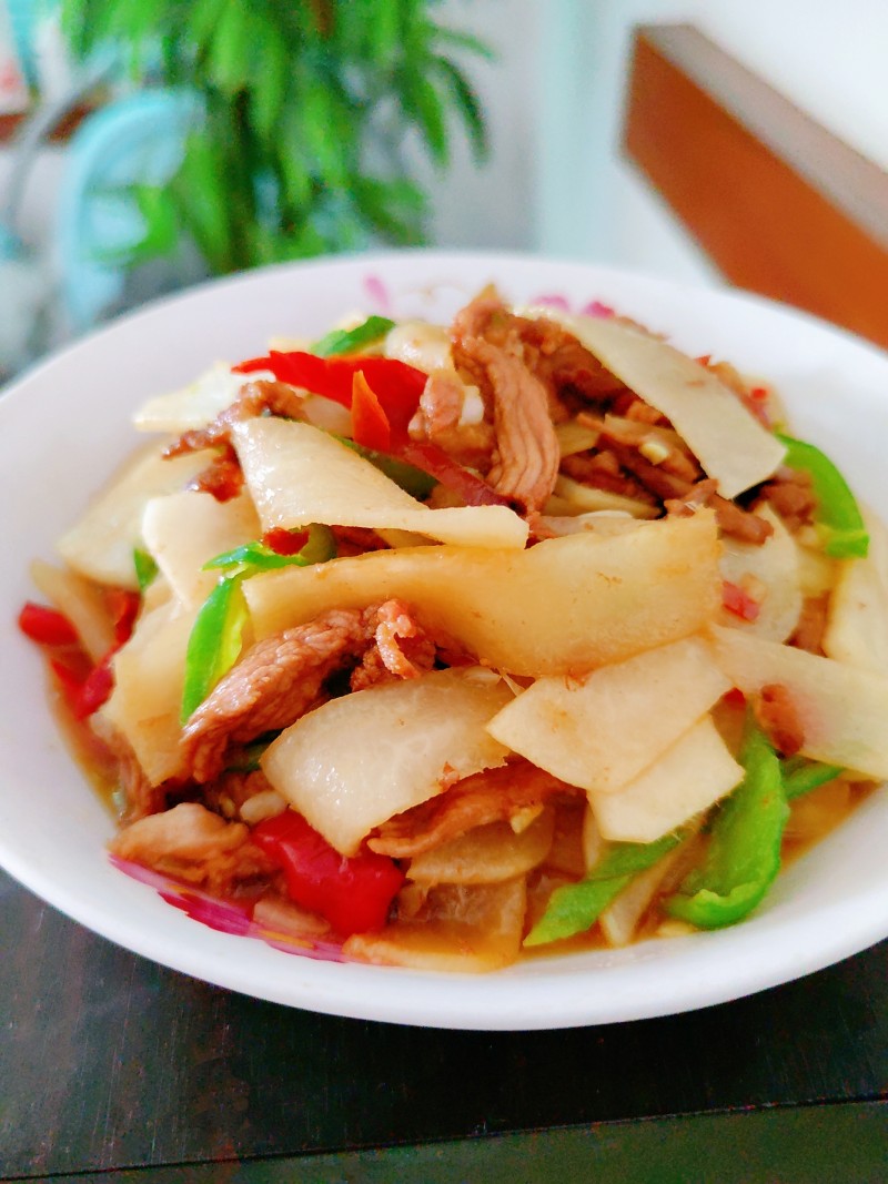 地瓜半个;瘦肉适量;青红辣椒各适量;大蒜头适量;