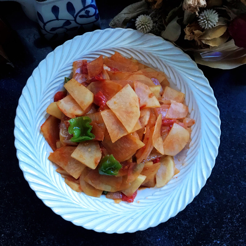 土豆1个;胡萝卜1根;姜2片;蒜4瓣;辣椒3个;植物油适量;糖适量;醋适量;盐适量;鸡精适量;
