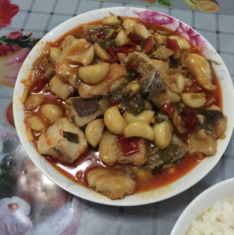 2:锅烧热,稍微多放点油,把大蒜,几粒花椒炸香炸黄,捞出。余油炒红泡椒泡姜,葱。放清水适量,煮开。倒入鱼肉和大蒜,中火煮五六分钟,汤汁最好刚刚淹着鱼肉。尝味看颜色可适量加生抽老抽和盐。如果汤太多就勾点淀粉芡汁。