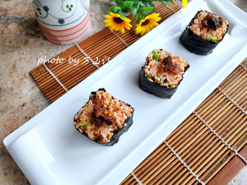 1.炒海苔里有食盐,不需要再加盐了。2.米饭不要煮的太软太粘。